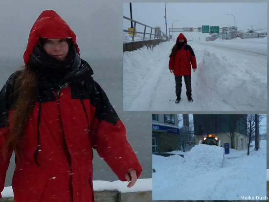 If I could choose between the everyday crazy traffic and yesterday's street conditions here with very few cars on the street, working public transportation, smiling people skiing and snowshoeing in the middle of main streets, people excitedly playing with their children in front yards - I would choose this blizzard any time! Almost everyone we met seemed to be joyful, children learned to ice skate on walkways, an ambitions snow shoveller greeted us after several hours of shovelling with an enthusiastic “Beautiful, eh...?!”€ť I can imagine that there were even less accidents than usual because so few cars were driving around here. I loved it! And for the next blizzard I definitely like some snow goggles and snow shoes like all the bright people we met.